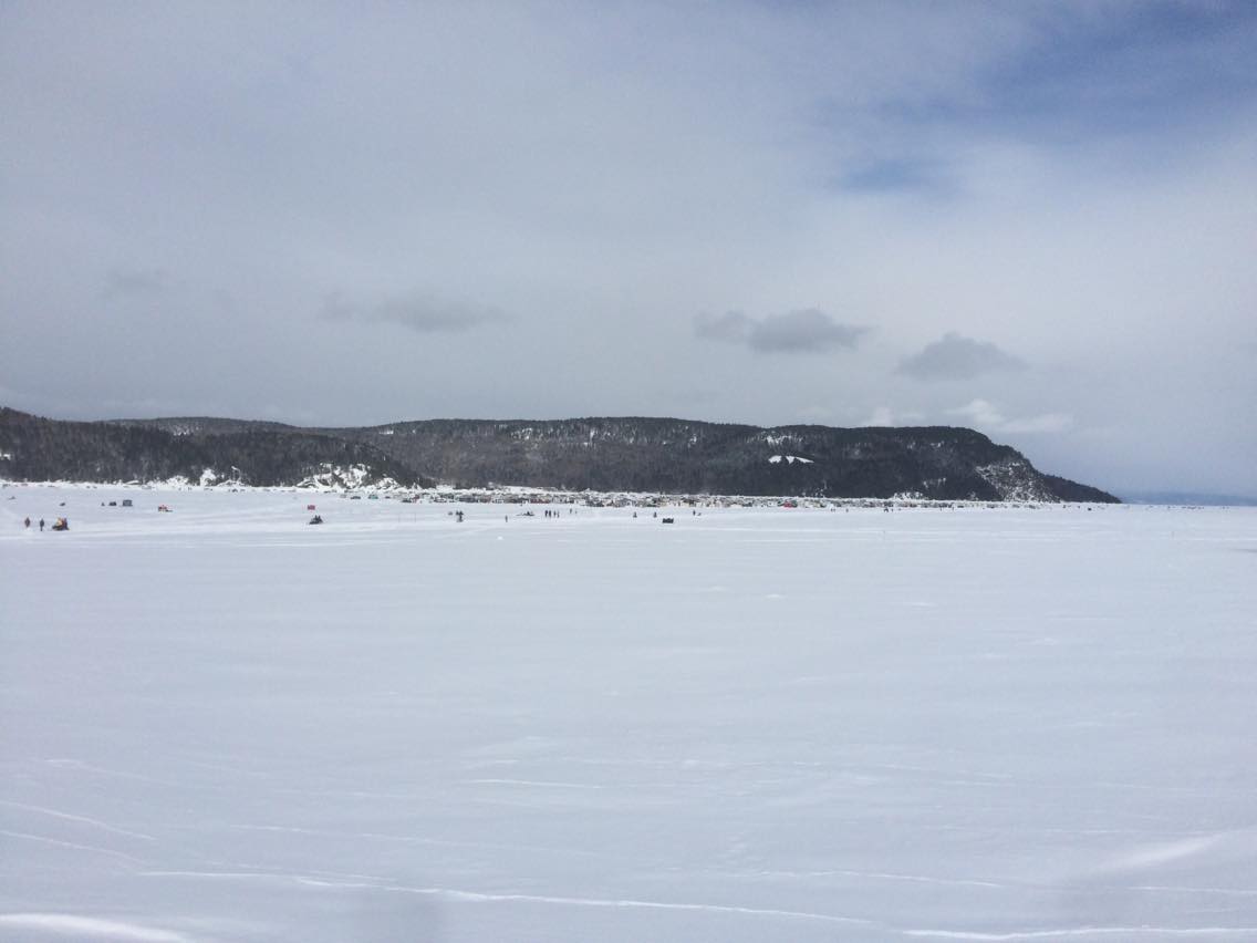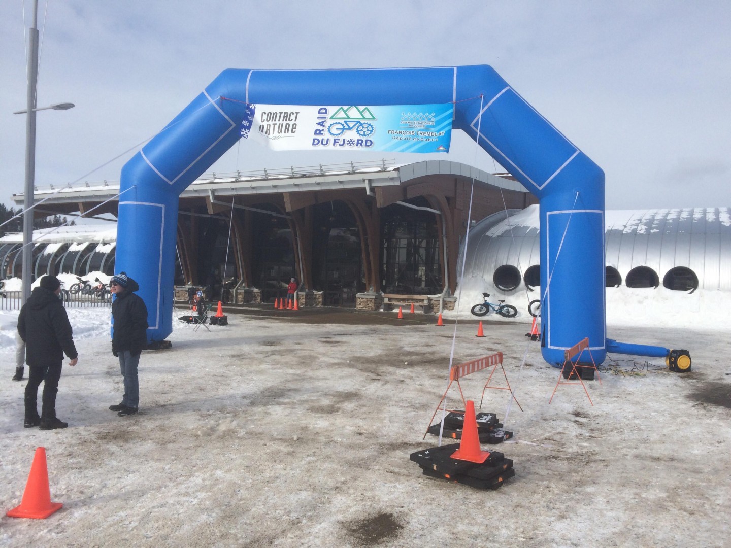 Après quelques kilomètres et une petite pause de groupe pour se ravitailler, on reprenait la ligne de départ pour le deuxième et ultime segment chronométré. J’avais pris le temps de discuter avec un participant qui m’a suggéré de diminuer ma pression d’air pour augmenter mon adhérence. Je m’étais aussi positionné dans les premiers, déterminé à combler mon retard. Ces efforts n’auront pas donné de résultats, car 1km plus loin mon pneu avant était complètement à plat. J’ai donc dû courir en poussant ma machine pour revenir sur mes pas pour ensuite emprunter une pompe et régler le problème. J’étais maintenant 10 minutes derrière le peloton et encore plus loin du podium. Sur une course sur route, ça aurait fait longtemps que j’aurais abandonné. Mais le Raid, c’est d’abord une aventure, pas une course. C’est donc en solo que je suis reparti pour finir le trajet. J’ai ainsi pu respirer l’air frais, absorber le soleil et profiter des paysages. Je crois que ce fut mon moment préféré de la journée, seul sur l’immensité des glaces. Ça m’a rappelé un des plus grands bonheurs en vélo : la liberté. Pour ce qui est du résultat, je ne les connais pas, mais j’ai fini bien loin de la première place. Mais honnêtement, ce n’est pas d’une grande importance