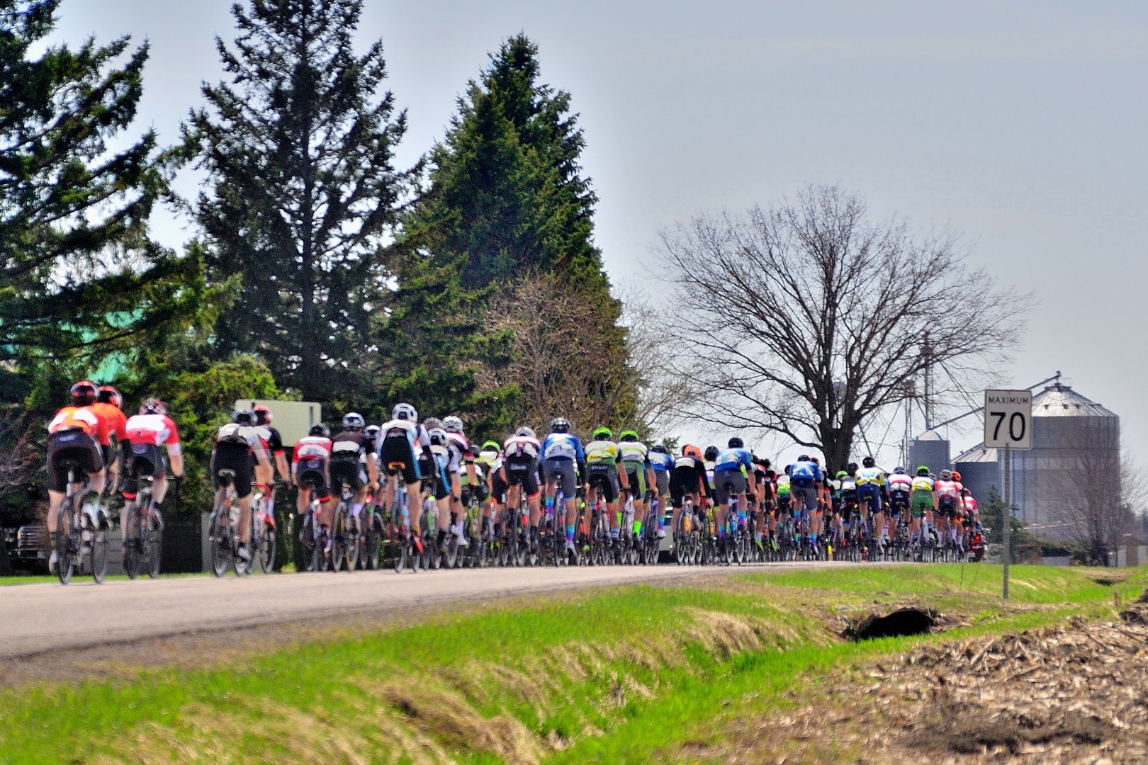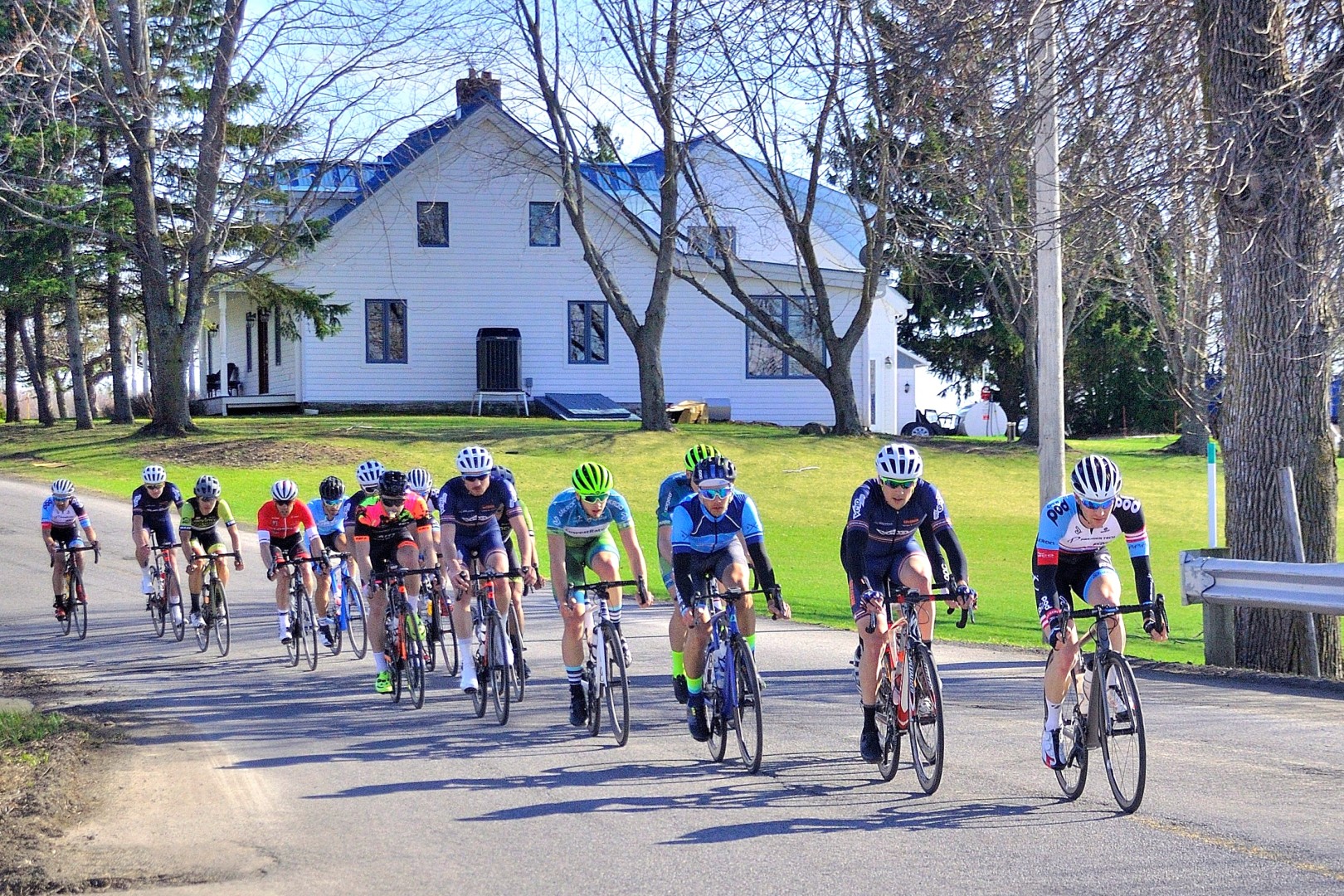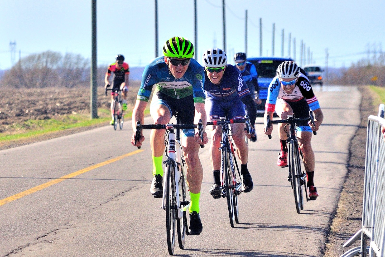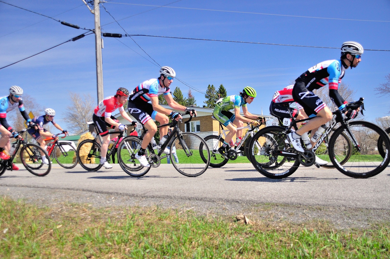 Le printemps québécois rime avec des épreuves où le vent règne en roi et maître sur un peloton déterminé à l’affrontement!  Lors de cette épreuve de 105 km composé de 10 tours,  90 coureurs de la catégorie senior 1 ont pris le départ.  Dès le premier tour, 6 gars de l’équipe Garneau se sont littéralement sauvé avec la course. Vu l’étroitesse de la chaussée, ils ont utilisé la bordure pour faire la cassure.  Le peloton a coopéré tant bien que mal pour revenir, mais en vain.