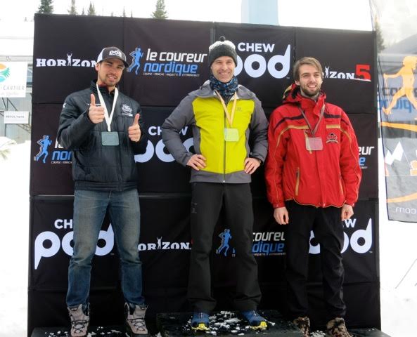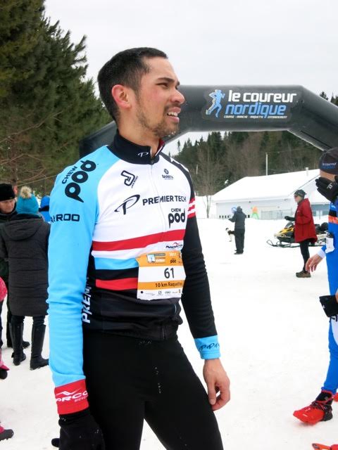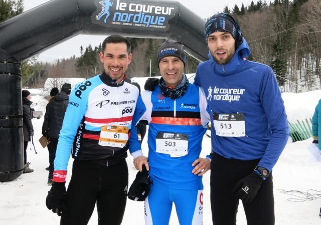 Un gros test… Coureurs de trail, raquetteurs, cyclistes, skieurs de fond…un amalgame d’athlètes prêts à se mesurer aux 350 mètres de dénivelé, sur neige molle! Au sein du groupe de tête de 5 coureurs après 1 km, Samuel tenait bon. Après 5 km, ce groupe sélect était réduit à 2 coureurs comprenant le représentant de Premier Tech p/b Chew Pod. Une chaude lutte s’annonçait avec une arrivée en sprint final, mais une chute anodine, provoquée par une racine, brisa le momentum avec seulement 2 km à faire. Il faut aussi dire en toute humilité que le moteur affichait -overheat- haha. C’est ce qui arrive lorsque l’on s’obstine à suivre un ex-olympien en la personne de Joel Bourgeois, spécialiste de la course de fond et vainqueur de cette course de trail.