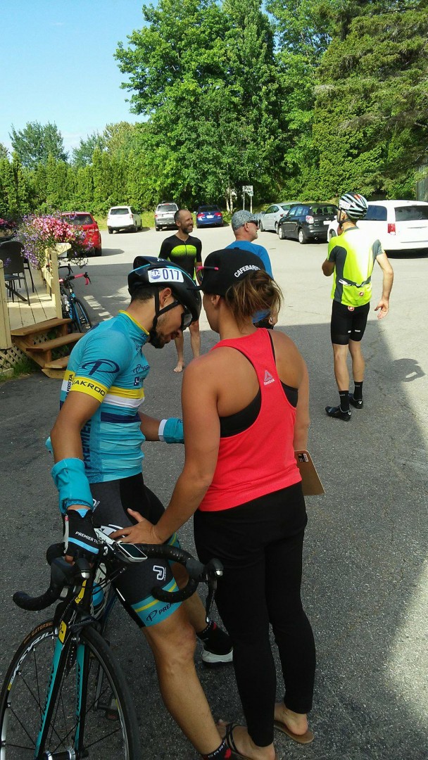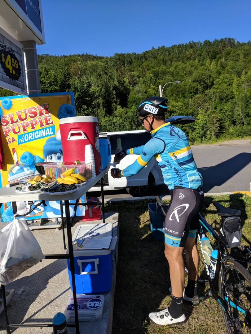 Lors de ce départ à 5:00 AM, les pattes encore excitées, Samuel et ses 4 compagnons de tête démarrent rapidement, trop rapidement! Raflant au passage les GPM au menu et quelques segments Strava tant qu’à être sur place, c’est la fringale qui attendait Samuel après 200 km et il restait toujours le fameux Parc des Grands Jardins. Terrassé de fatigue avec sandwich de crème glacée en main pendant un bon 15 min, Samuel repris son courage à deux mains et se mis en chasse patate pour tenter de combler l’écart de 10 min le séparant des deux hommes de tête.