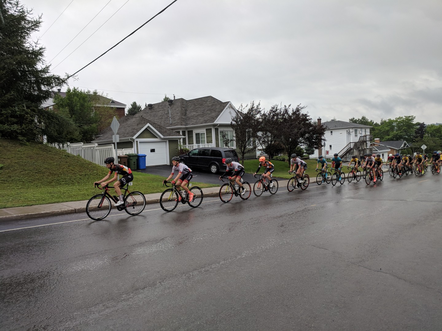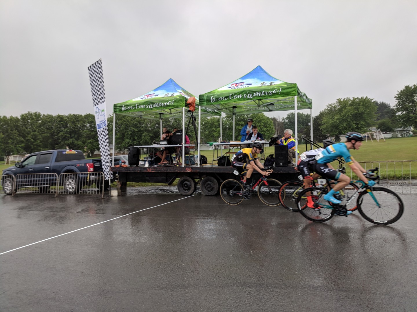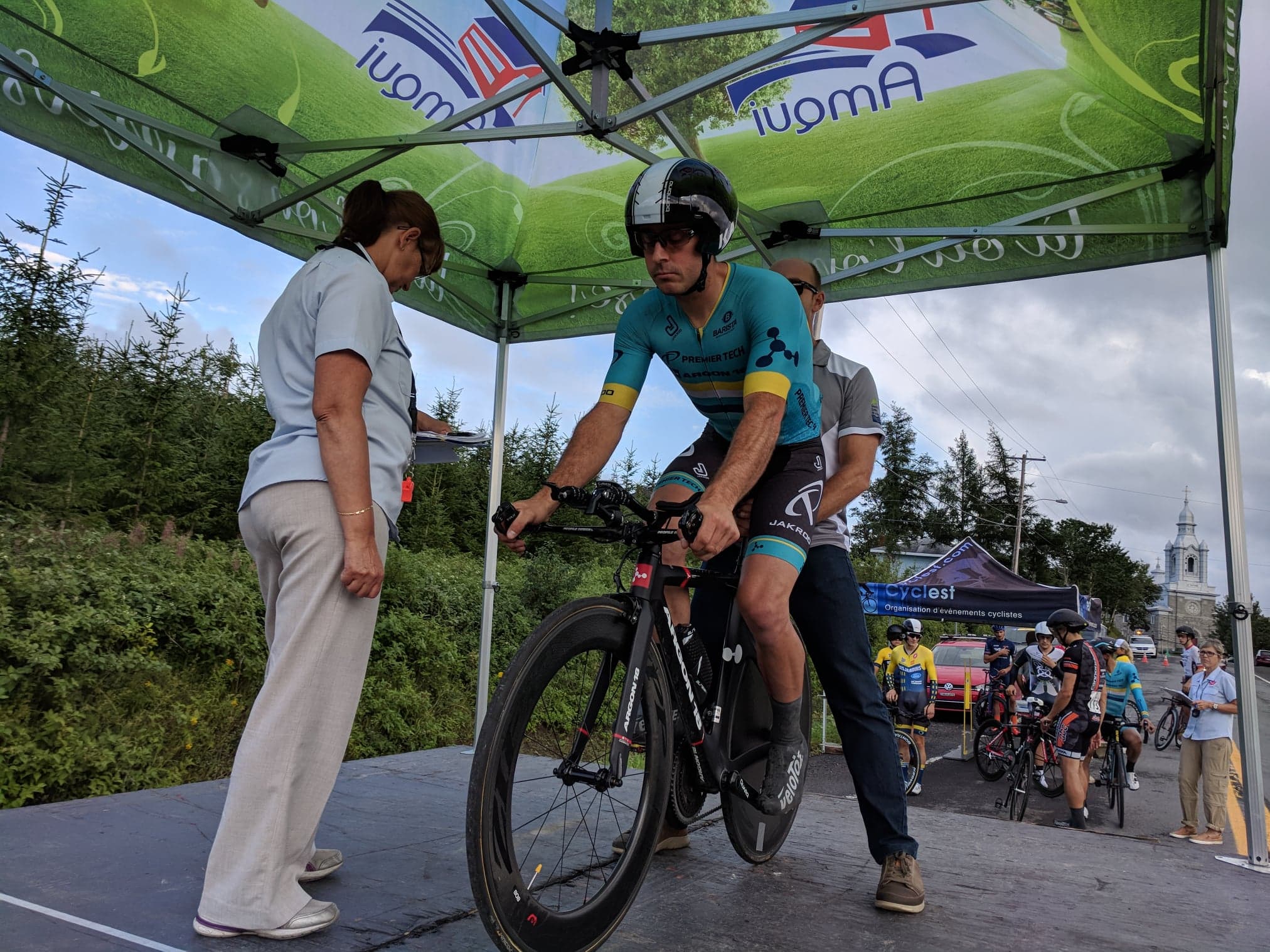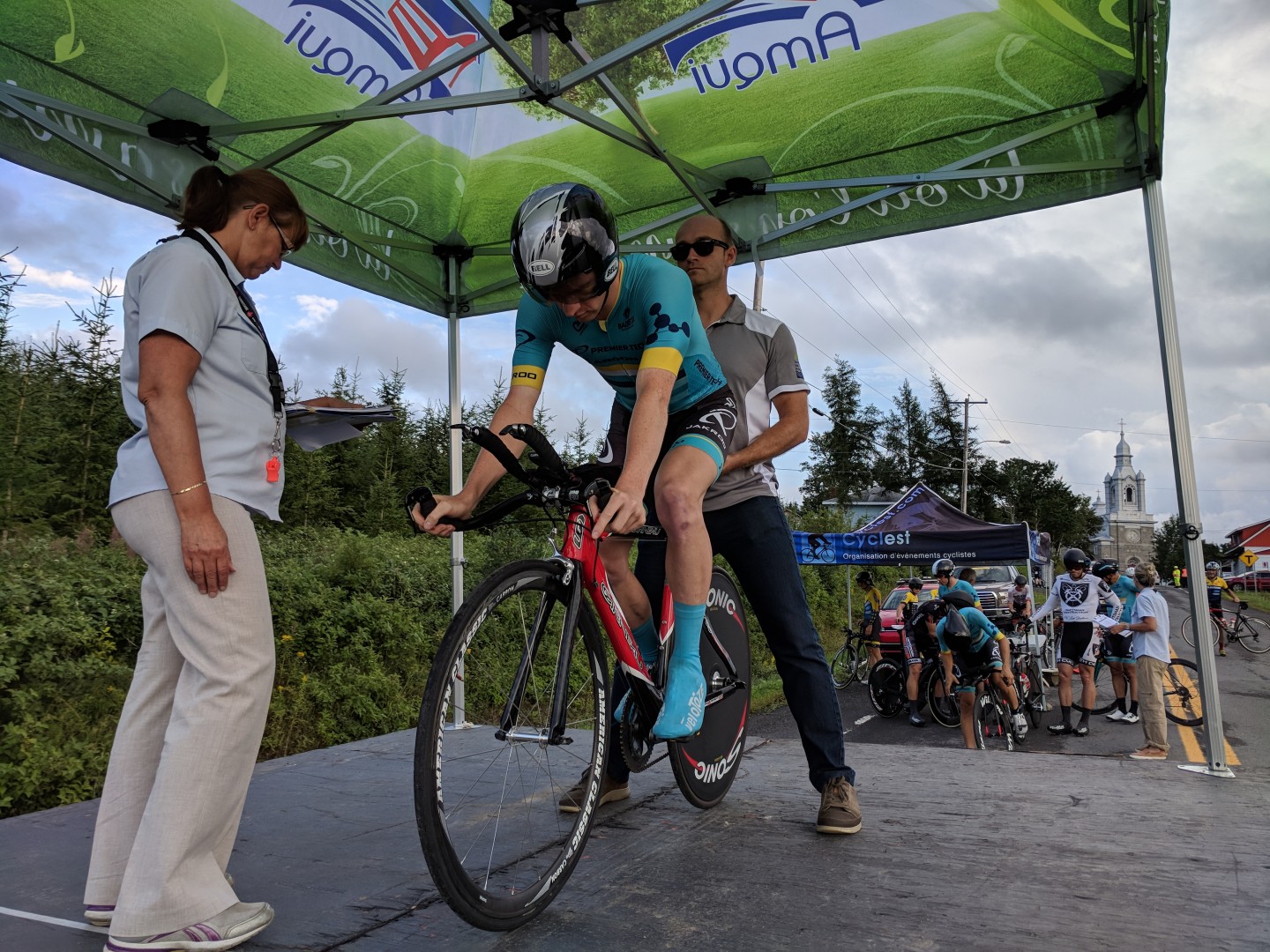 60 coureurs prenaient le départ de cette première étape du grand prix de la Matapédia sous un ciel gris et menaçant. 6 équipes assez homogènes et quelques coureurs indépendant rendirent la course à la fois stratégique et sélective. Longue de seulement 71 km et composée de 9 tours d’un circuit 7.9 km, trois grands prix de la montagne et un sprint intermédiaire venaient dynamiser la course. Les coureurs de Premier Tech Argon 18 chérissaient 2 objectifs, le maillot à pois et une victoire d’étape. Il n’y a pas à dire, avec de tels objectifs de course, le banquet d’ouverture de la veille se devait de mettre la table.