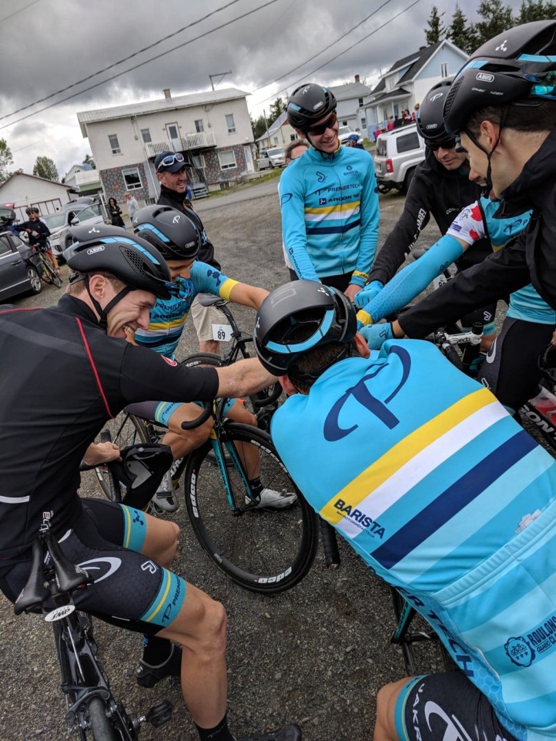 À ce jeu, nos rouleurs réussirent encore une fois à se démarquer. Après avoir suivi tour à tour les attaques dangereuses, c’est finalement Simon qui plaça le coup de reins décisif. Profitant d’un des seuls ralentissements, il fit une accélération qui le séparera rapidement du peloton. Un demi-tour plus tard, il fut rejoint par un autre coureur. L’écart atteignit rapidement 20 secondes et il demeura ainsi pendant une quinzaine de kilomètres. Malheureusement, une mauvaise collaboration en fin de course mit fin au rêve de Simon de répéter les exploits de ses coéquipiers. Avec à peine 3 petits tours à faire, les deux fuyards furent avalés par ce qui restait du peloton et on se dirigeait vers un sprint d’un groupe réduit. Malheureusement, pour Premier Tech p/b Argon 18, un positionnement inadéquat dans le dernier tour enleva toute chance de retourner sur le podium. Au moins, Jules termina dans le temps du premier pour conserver sa place dans le top 10 au général. Samuel, quant à lui, termina en une respectable 12ème place.
