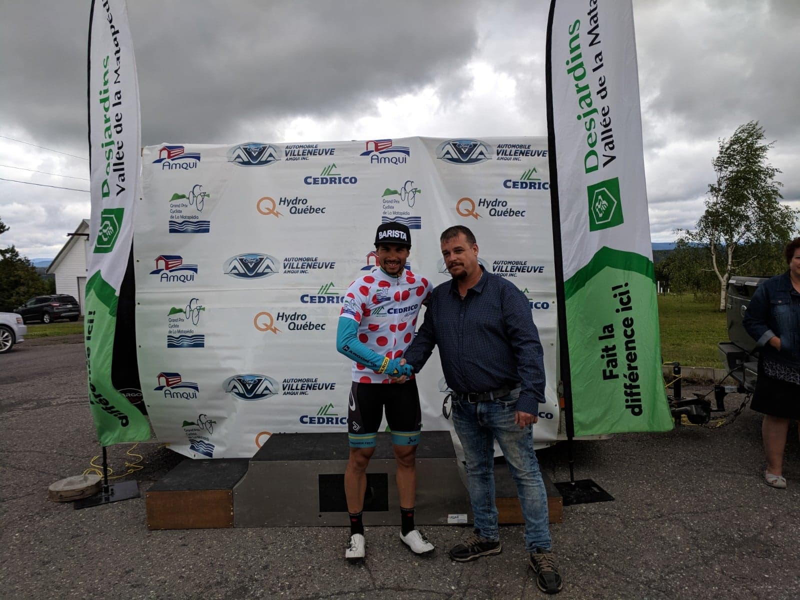 C’est lors d’un court moment de flottement et avec encore 6km à faire que Jules et deux autres coureurs placèrent une attaque franche pour se distancer de ce groupe sélect. Avec un coureur de Probaclac et un autre de Desjardins / Ford, les 2 équipes les plus nombreuses, l’échappée avait de bonnes chances de se rendre. Grâce à un effort soutenu et une bonne collaboration, ils se creusèrent une avance de près de 45 secondes. Lors du dernier GPM, Jules prit la tête pour assurer le tempo ce qui mit à mal Jonathan Cassivi de Desjardins / Ford. Profitant de l’opportunité, Olivier Péloquin de Pobaclac attaqua le groupe avec 2km à faire. Jules jetât alors toutes ses forces pour revenir sur lui mais il lui manqua quelques mètres pour faire la jonction avant la descente vers l’arrivée. Au final, notre grimpeur arrive 2e de l’étape et pointe maintenant au 11e rang du classement général, à moins d’une minute du maillot jaune.