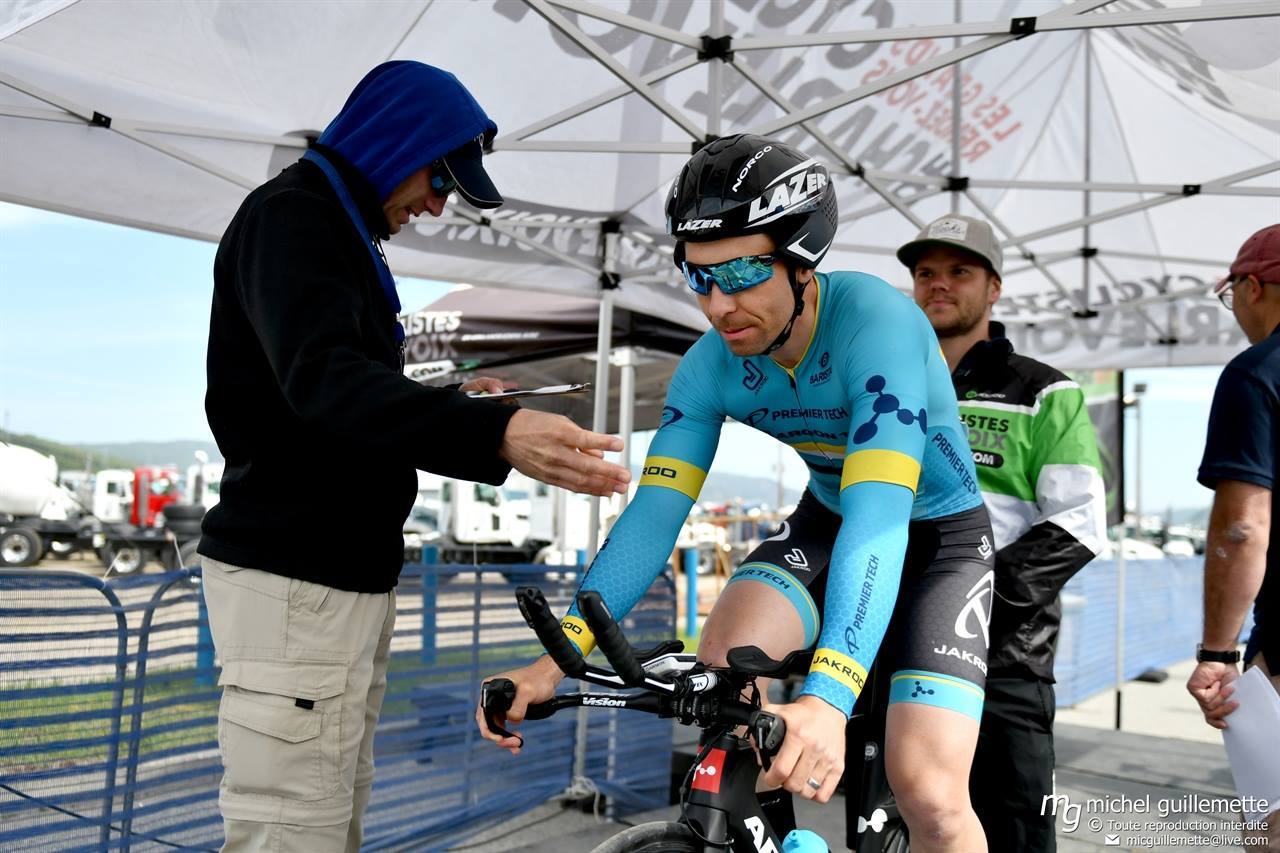 Parcours de 19 km assez plat et roulant. Le départ se prenait avec un bon vent de dos ce qui rendait très rapide cette première portion, par contre le retour se faisait avec un difficile vent de face sur 9 km. Notre spécialiste Mathieu Gabriel enregistre une solide performance avec le meilleur temps de l’équipe (25:27 min). Guillaume Fiset avec son tout nouveau vélo de contre-la-montre Argon 18 E-117 le suit tout juste à 3 secondes. Simon Hamel, David Barry et Jules Cusson-Fradet ont aussi démontré de belles performances en complétant le top 25. Certains membres de l’équipe ont préféré garder leurs énergies pour les autres épreuves. Rien n’est joué au Grand Prix de Charlevoix jusqu’à la dernière épreuve!