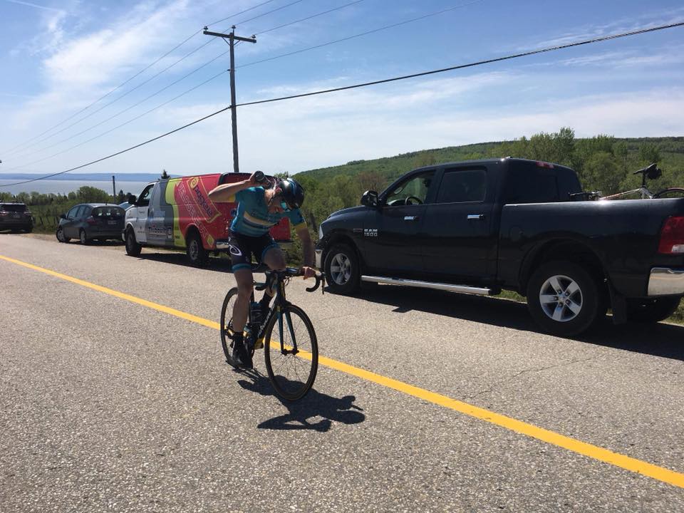 La course sur route du Grand Prix cycliste de Charlevoix est bien entendu l’étape reine ou tout peut arriver. Avec un classement général favorisant les échappés, le mot d’ordre pour tous les coureurs de l’équipe était bien entendu d’en faire partie à tout prix. Tel que prévu, c’est dans le premier Kilomètre de la course qu’un groupe de 11 coureurs réussi à se détacher du peloton dans lequel faisaient parties Guillaume Fiset et André Trembley. Les premières ascensions de la course ont fait beaucoup de dommages autant dans le peloton séparant celui-ci en 2 groupes que dans l’échappé le réduisant à seulement 5 coureurs dont nos deux costauds. André tel un gladiateur fourni beaucoup d’efforts dans l’échappé afin de garder un écart avec le peloton qui pouvait laisser croire au grand honneur pour Guillaume. C’est avec un peu plus de 3 minutes d’avance sur le peloton que l’échappé entame la légendaire monté de Sainte-Irénée. Durant l’ascension un coureur de l’équipe Devinci réussi à se détacher et ne fut malheureusement pas rejoins par Guillaume et André. Malgré tout, Guillaume jeta ses dernières forces dans les 13 derniers kilomètres pour fuir les 2 derniers coureurs de l’échappé et ainsi monter sur la deuxième marche du podium.