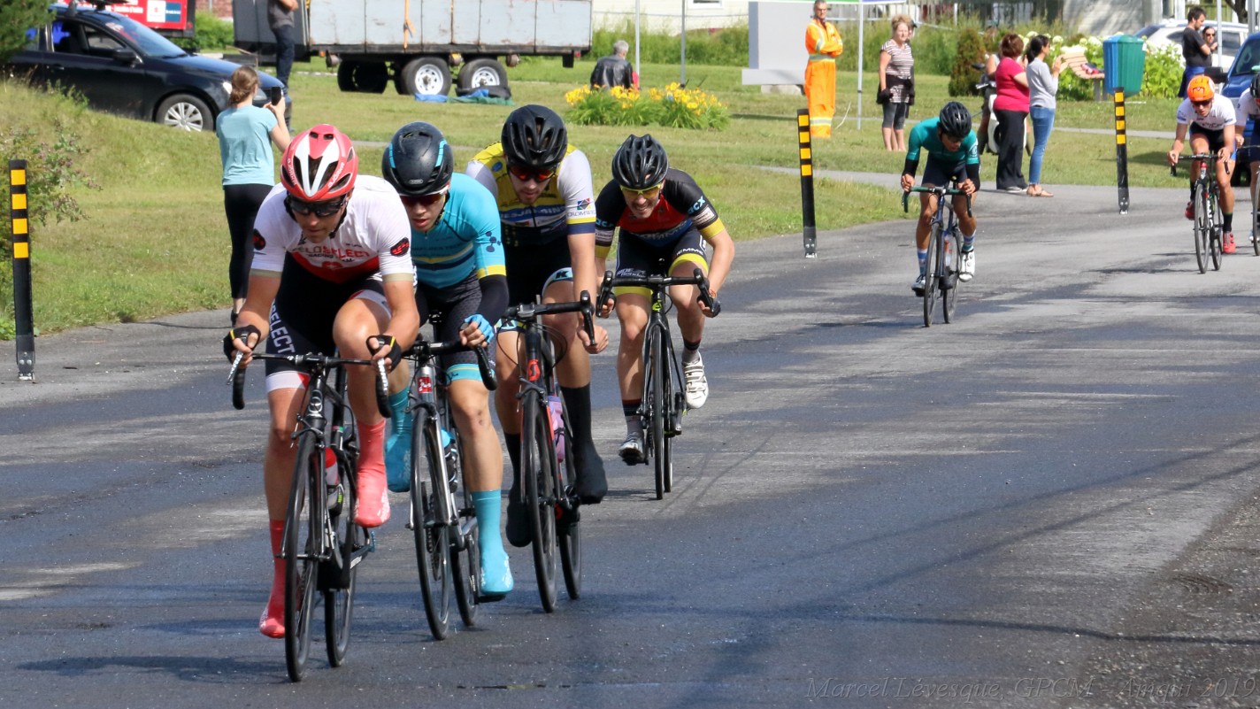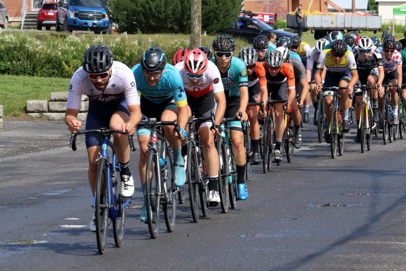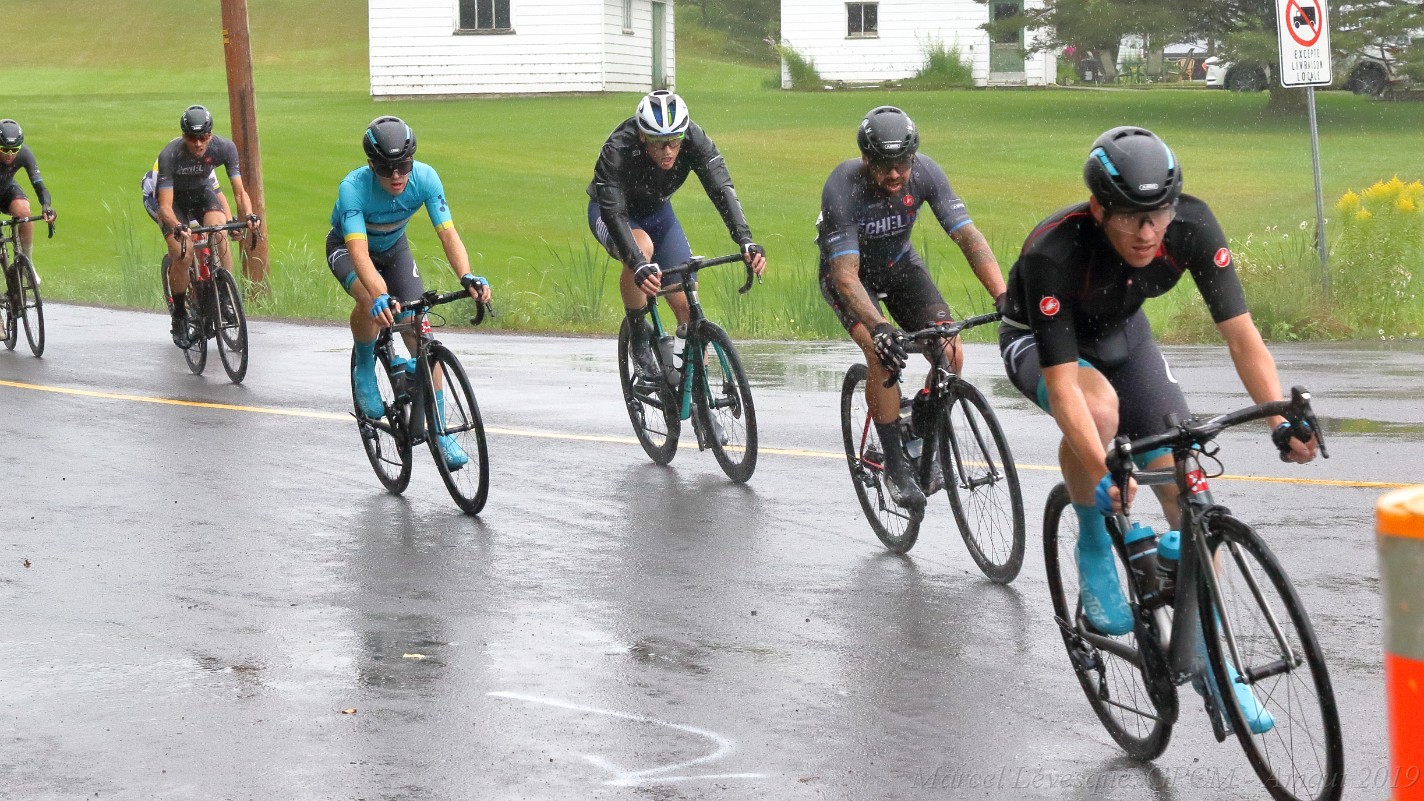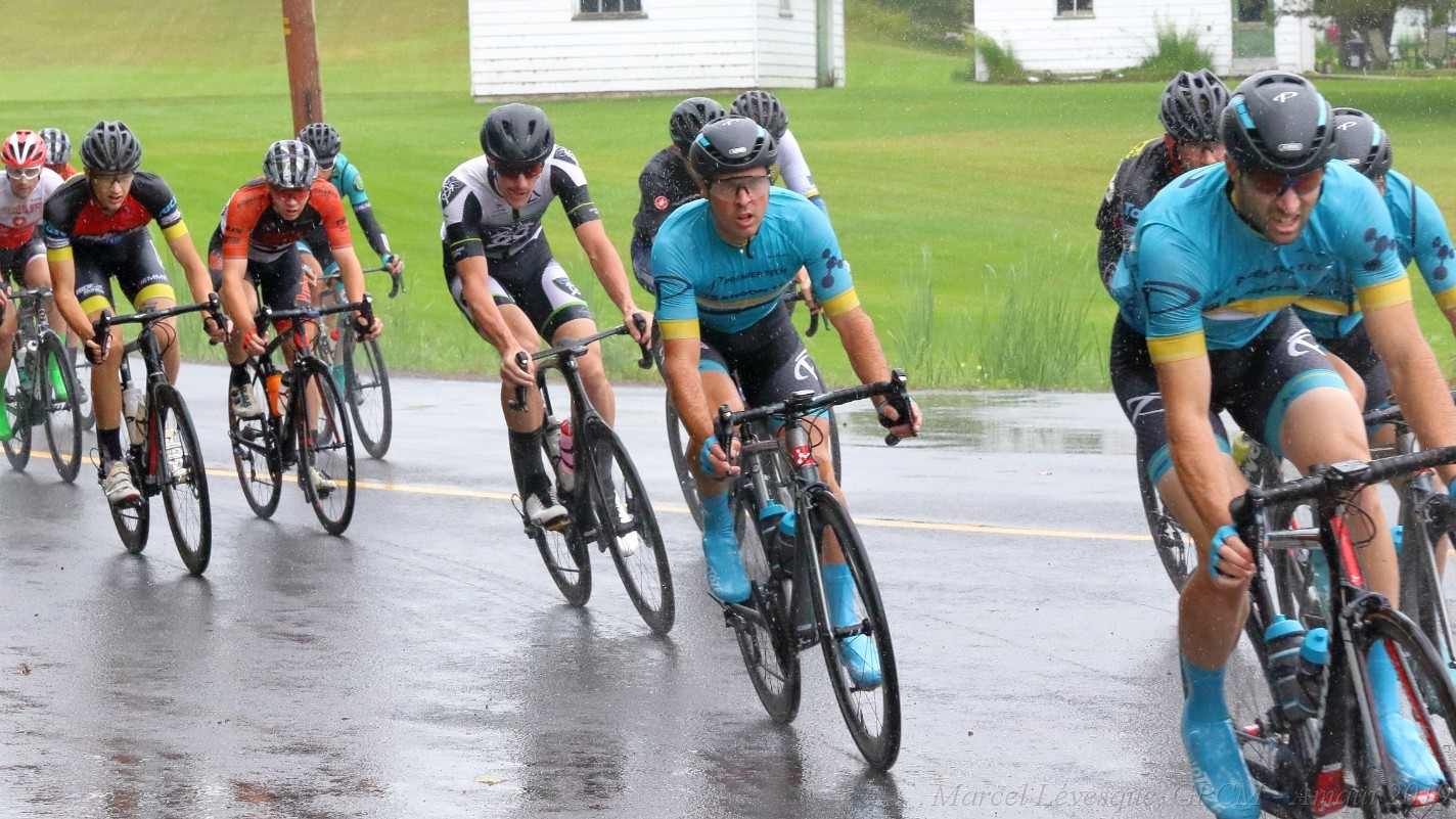 Si la pluie était de la partie, le niveau relevé de ce peloton l’était aussi, si bien que dès le coup de départ lancé, les attaques fusaient de partout avec plusieurs tentatives d’échappées infructueuses. À la mi-course, Simon Hamel notre baroudeur de service réussi à creuser un écart intéressant avec 6 autres coureurs. À l’arrière, le peloton était très nerveux avec de nombreuses accélérations. Deux coureurs profitèrent de cette confusion pour se détacher et partir en chasse. La jonction s’opéra avec environ 10 km à faire, mais Simon, bien entamé par ses efforts, n’a pas pu s’accrocher aux trois coureurs qui pressèrent sur l’accélérateur pour prendre la poudre d’escampette.