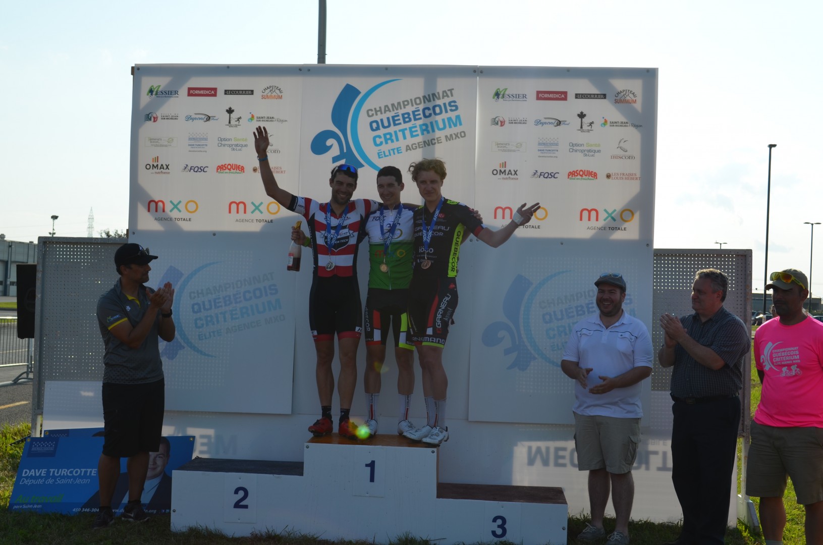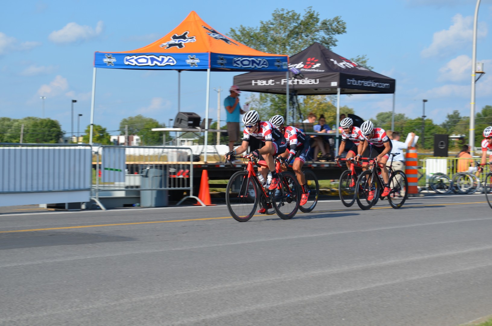 Pour une troisième année consécutive, les Championnats québécois de critérium se déroulaient à St-Jean-sur-Richelieu. Cette année cependant, le parcours avait changé. Un beau gros quadrilatère de 1,5 km avec quatre virages bien larges et un parcours exposé au vent, plutôt fort en cette journée. 25 cyclistes au départ, mais un peloton qui ne manque pas de calibre et quatre coureurs pour l’équipe Norco/Premier Tech propulsée par ChewPOD.